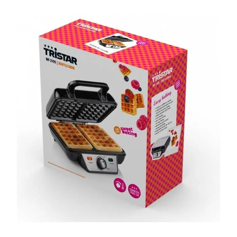 Appareil à Gaufres TRISTAR - Puissance: 1000 Watts - Cuit 2x Gaufres à la fois - Protection contre la surchauffe - Thermostat réglable - Température maximale: 180°C - Plaques gaufrées antiadhésives - Indicateurs lumineux - Poignée isolante - Pieds antidérapants - Nettoyage facile - Cordon d'alimentation: 0.7 mètre - Dimensions de la plaque de cuisson: 23 x 17 cm - Couleur: Noir - Garantie: 1an