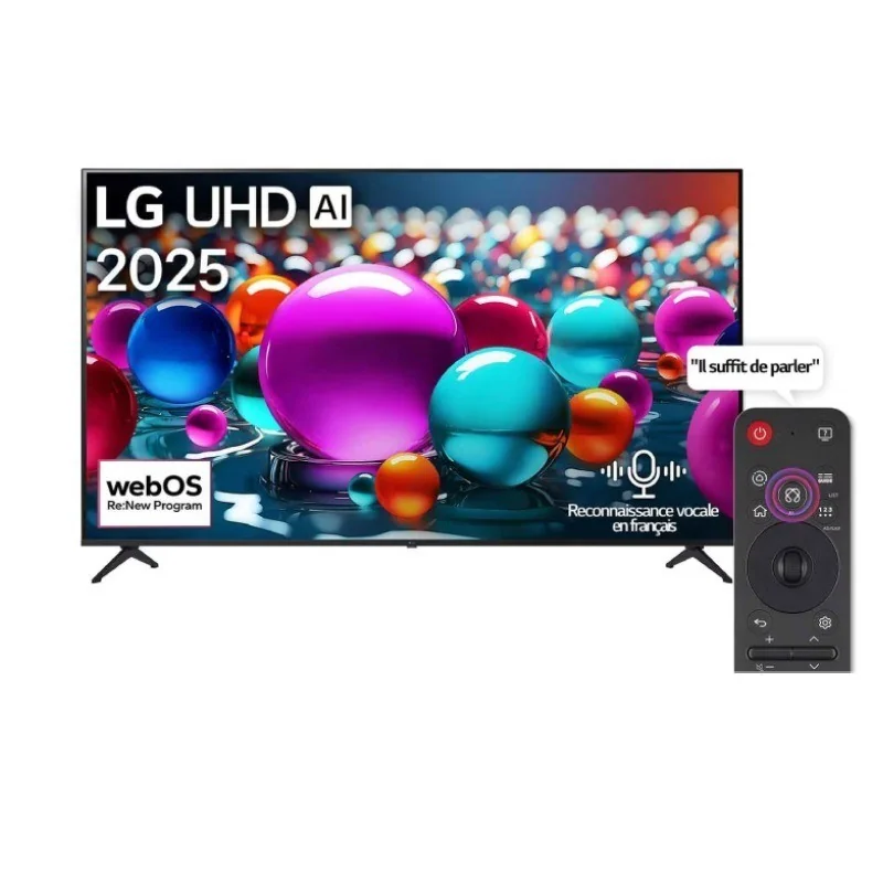 TV LG Smart 55" UA85 - Résolution: 3840 x 2160 Pixels 4K Ultra HD - Système d'exploitation: webOS 25 - Processeur: Alpha7 AI 4K Gen8 - Taux de rafraichissement: 60Hz Natif - Rétroéclairage Direct LED - Technologie: HDR10 / HLG - Alpha7 AI Sound Pro (Upmix virtuel 9.1.2) - Synchronisation sonore LG - Sortie Audio: 20W - Diffusion haut-parleurs: Canaux 2.0 - Chatbot IA, Navigateur Web complet, Google Cast, Google Home / Hub - MODE CINÉMA™ - Optimiseur de Jeu - Application Smartphone: LG ThinQ - Reconnaissance vocale intelligente - Connectivité: WiFi 5, Bluetooth 5.0 - Connecteurs: 3x HDMI, 1x USB 2.0, 1x RJ45, 1x Sortie audio, 2x entrée RF - Poids avec support: 11.6 Kg - Dimensions avec support (LxLxH): 1236 x 780 x 230 mm - Couleur: Noir- Garantie: 2 ans - Livraison "Gratuite"